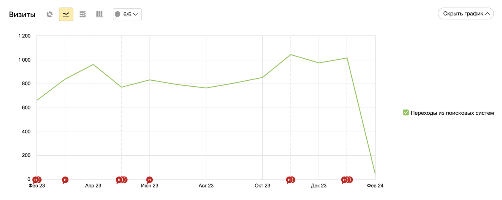 Увеличили трафик на сайт в период с февраля 2023 года по февраль 2024 года на 48%